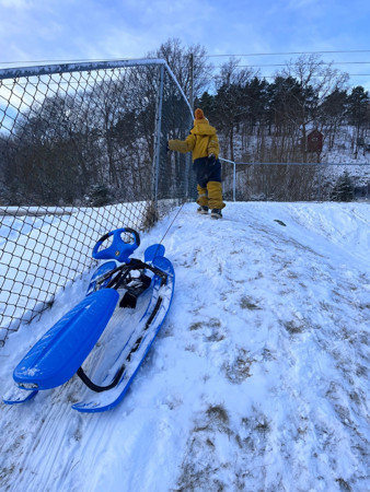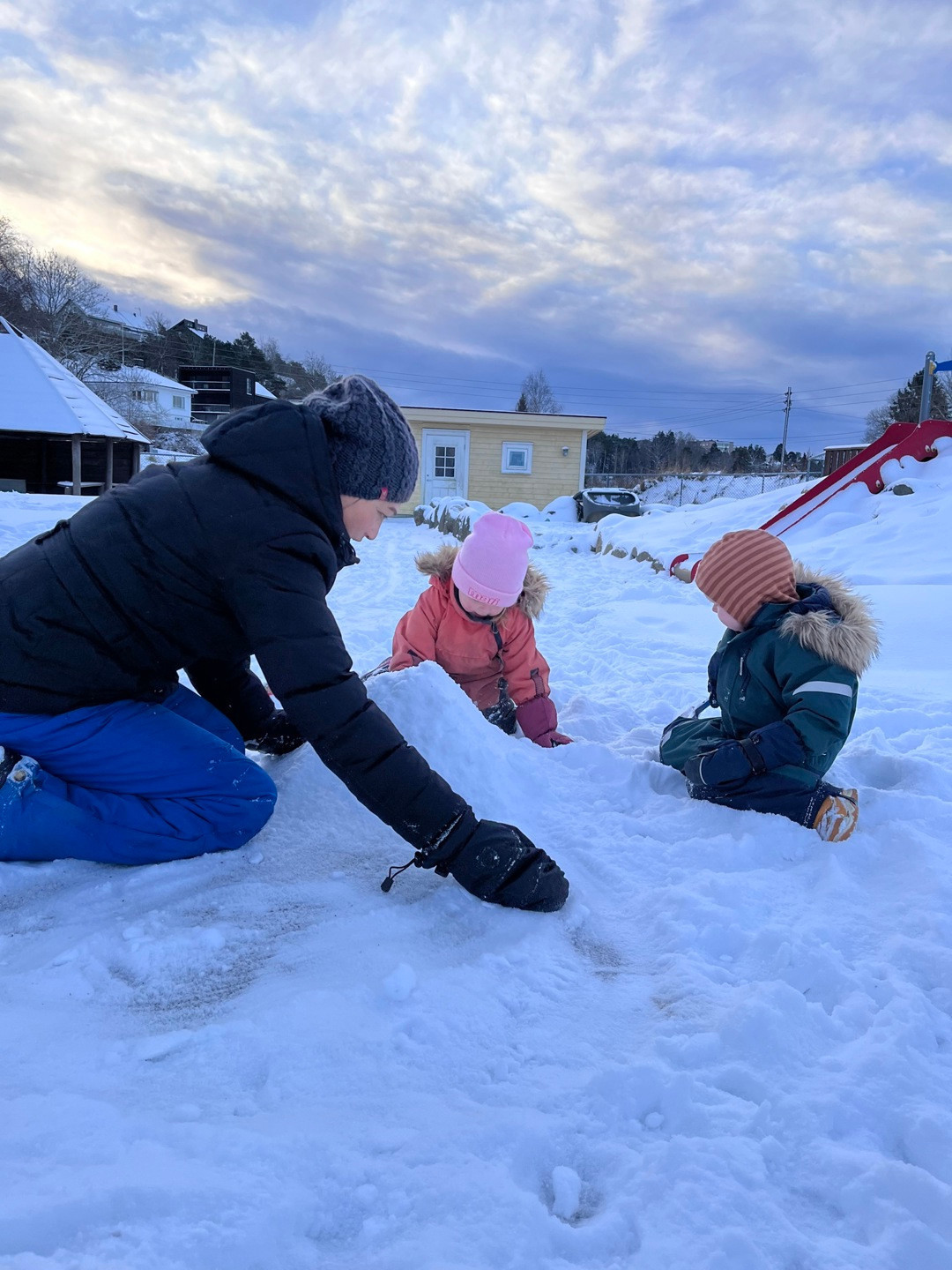 "Se opp!" -Her får vi øvd inn blant annet turtaking, balanse, koordinasjon, vise hensyn til hverandre i akebakken og ikke minst slageren; vente på tur:-) Snømenn lages, snøborger og -huler planlegges nøye. De blir ikke alltid slik man har sett for seg, men veien blir til mens man går.